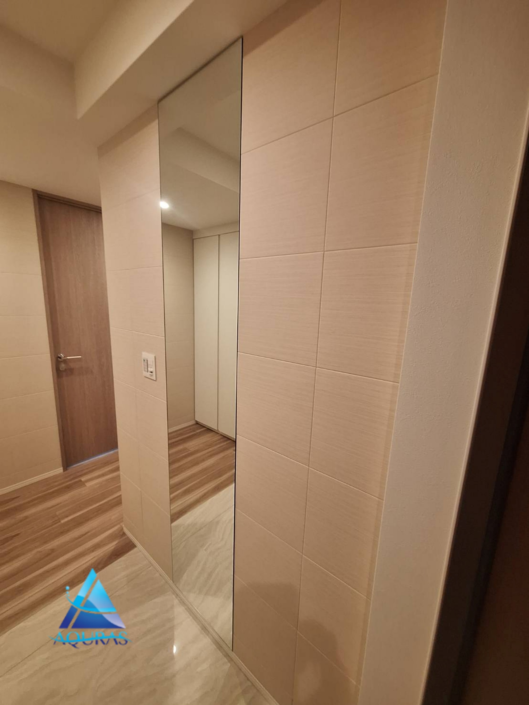 エコカラット 玄関 ペトラスクエアから【ストーングレース】(チャコール)に貼り替え+ミラー幅45cm