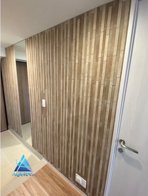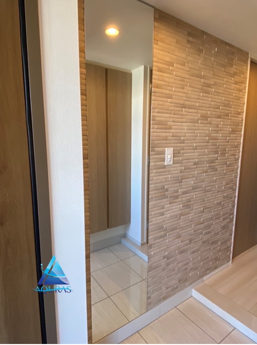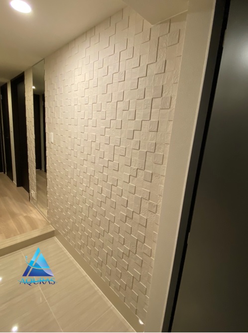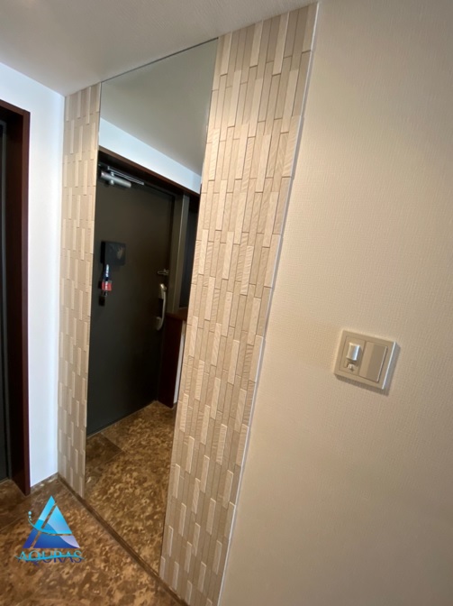 玄関 ミラー幅60cmの両サイドに【ニッタイタイルRT-PB04】(モデルルーム仕様)タイルの両サイドにエコカラット【フェミーナ】(ホワイト)とのデザイン貼り