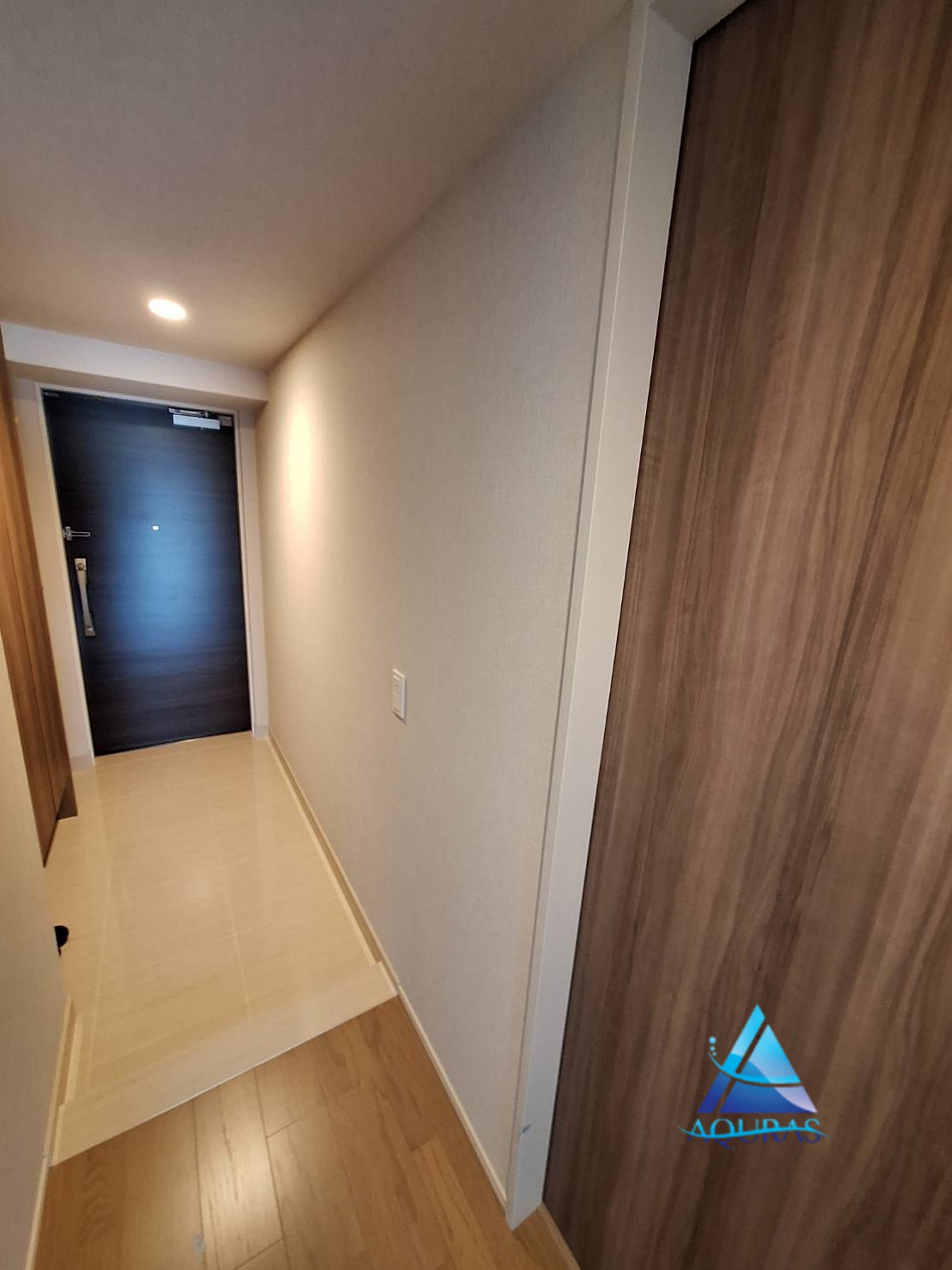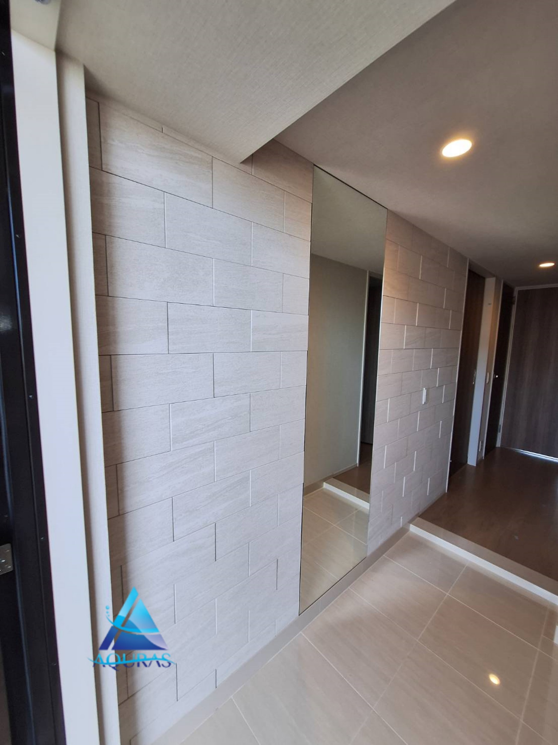 玄関にエコカラット【ヴァルスロック】(ホワイト)+ミラー幅60cmを施工させていただきました。【ヴァルスロック】はスイスのヴァルス地方で採掘される石材の意匠を使いやすくアレンジしたデザインです。