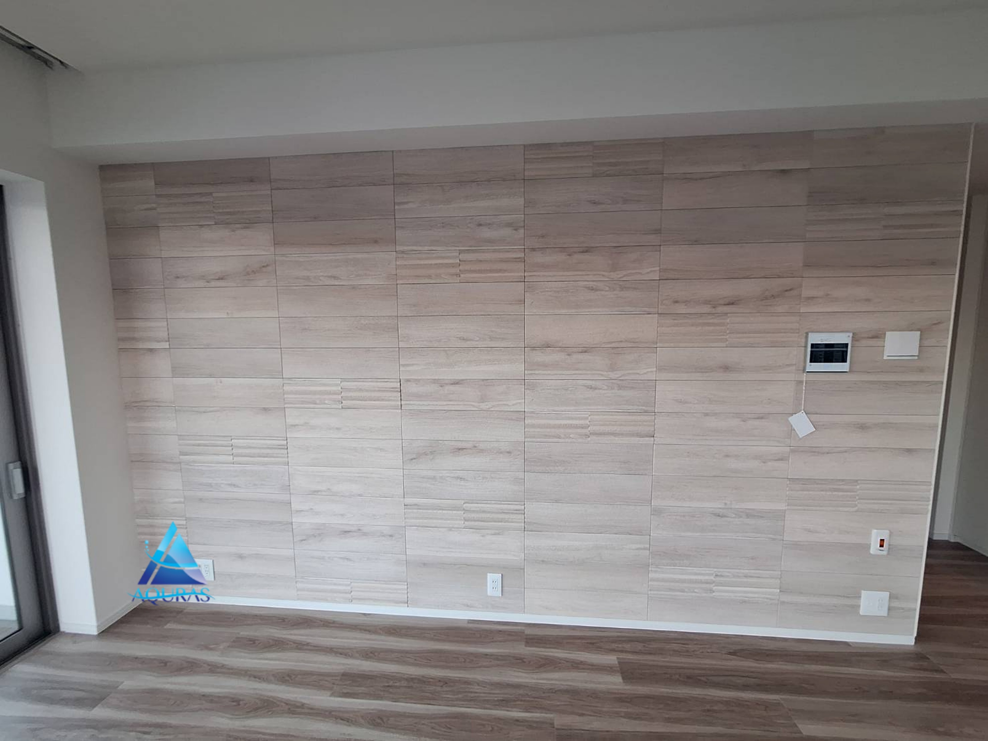 リビングにエコカラット【ビンテージオーク】(アイボリー)を施工させていただきました。【ビンテージオーク】はビンテージな風合いのある木目柄のデザイン。ナチュラルなインテリア空間にお薦めです。