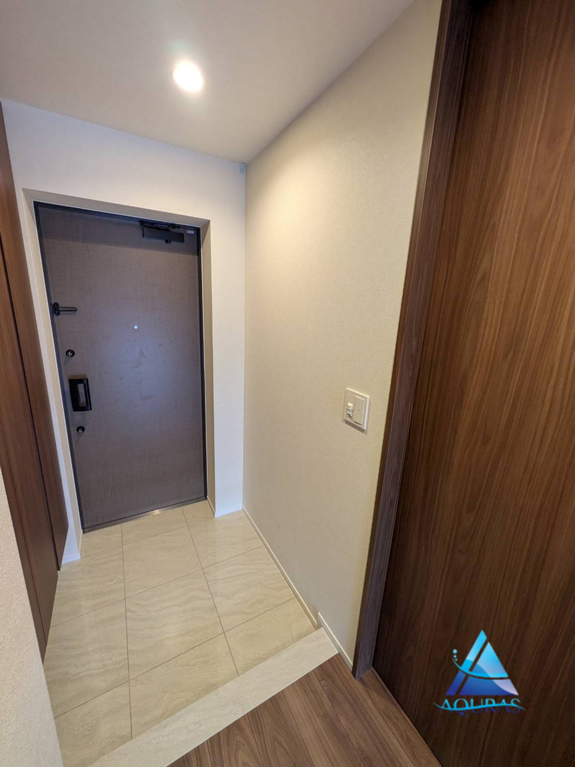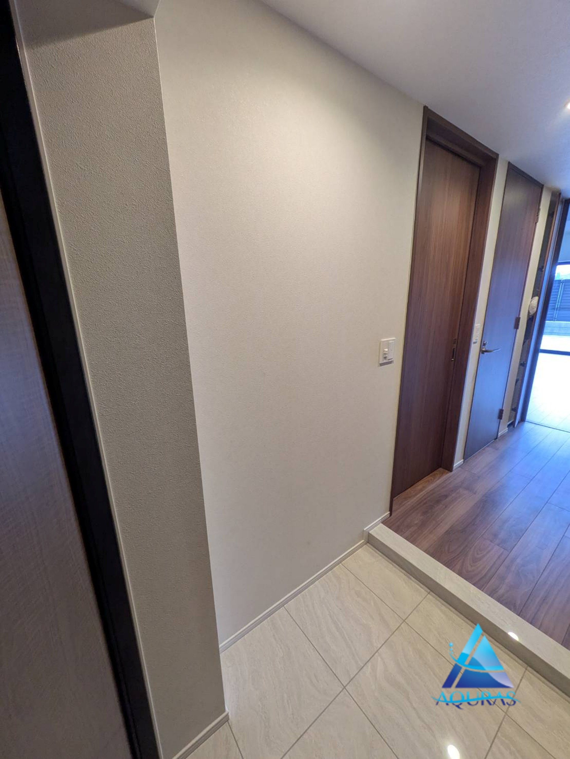 玄関にエコカラット【ペトラスクエア】(ライトベージュ)を施工させていただきました。【ペトラスクエア】はナチュラルな石面凹凸デザイン。ライティングによる陰影が美しい壁面を演出します。