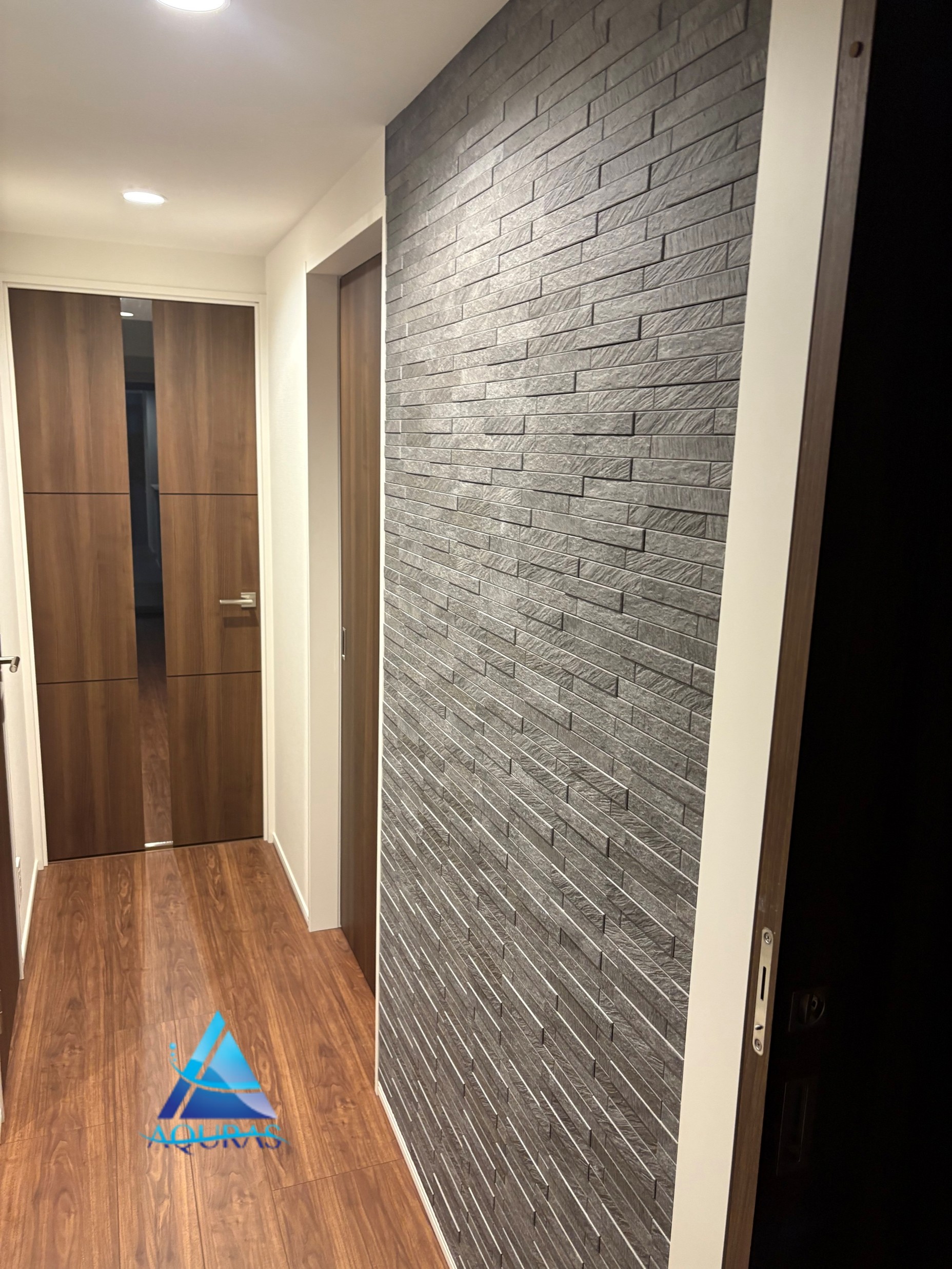 廊下にエコカラット【ルドラNX】(ダークグレー)トイレに【ルドラNX】(ホワイト)を施工させていただきました。【ルドラNX】はクォーツサイトの石柄を表現したモノトーンのクールな意匠は、モダンでミニマルなインテリア空間にお薦めです。