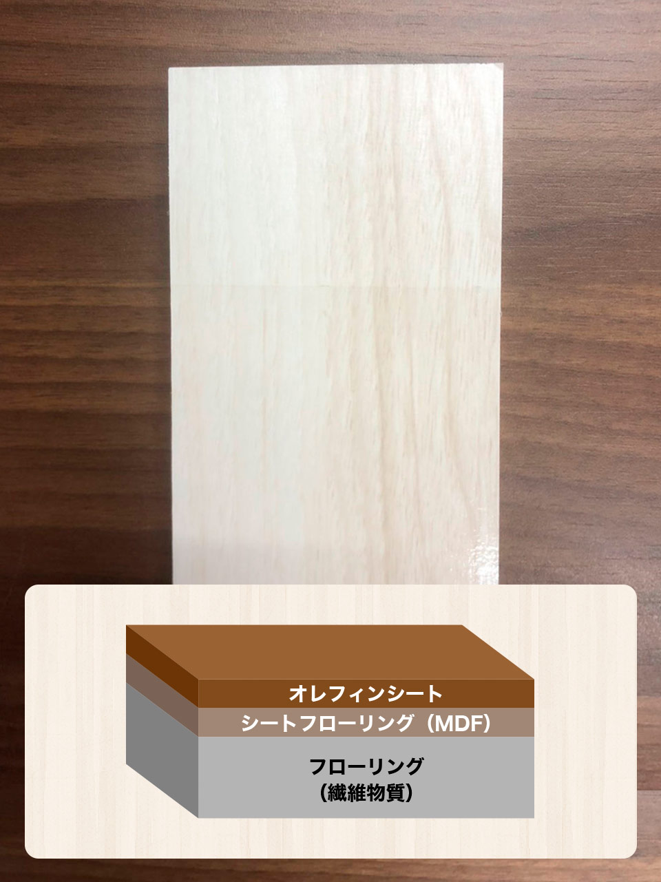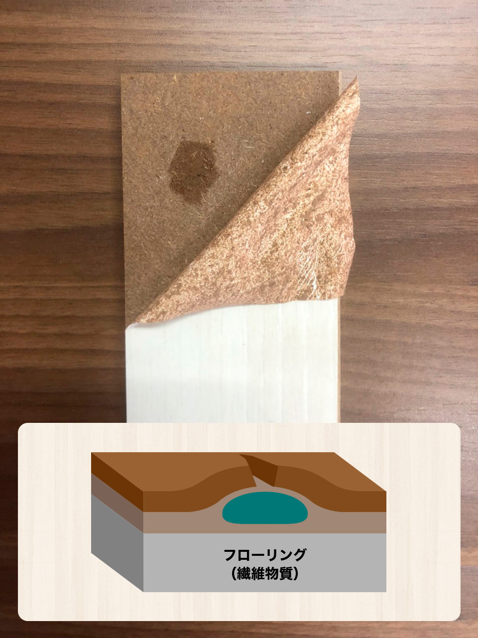 近年ではマンションのフローリングで主流となっております「シートフローリング」は表面のつなぎ目部分や生活していく中で表面にキズやひび割れになったりするとそこに水などが入り込み内部の繊維材質が水分を吸いこんで膨張するという事例があります。家具家電が増えたり移動することは生活する上で必ずありますよね?