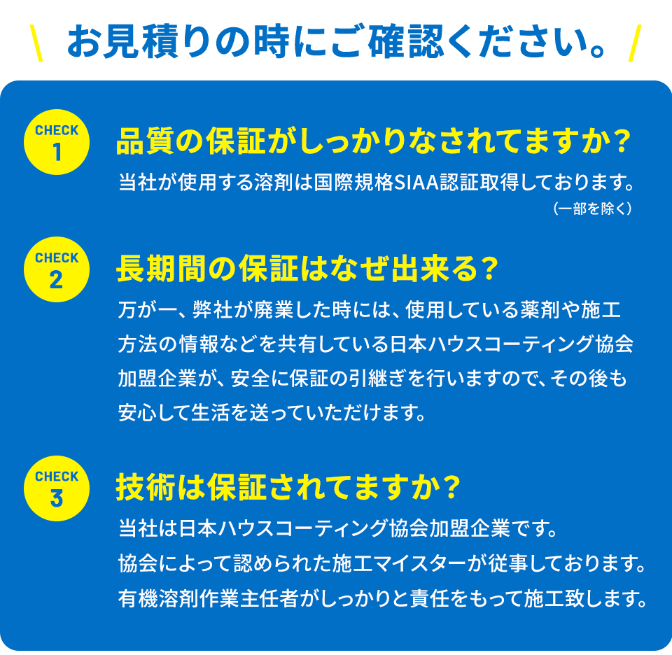 お見積もりの時にご確認ください 当社は技術保証・品質保証・期間保証これらのすべてをクリアしております。