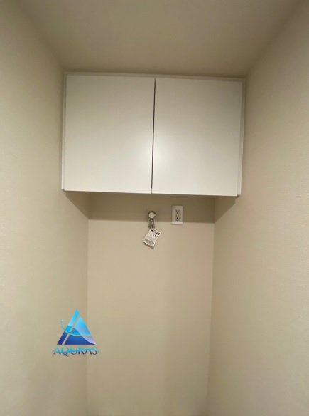 東京都江東区 ジオ南砂町 S様エコカラット 玄関【ストーングレース】(ベージュ)馬貼り+ミラー幅45cm 洗濯機上吊戸棚 扉色:マットホワイト