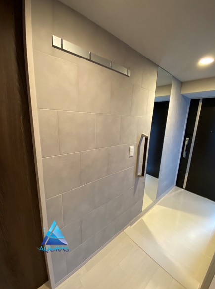エコカラット 玄関【ファインベース】(グレー)馬貼り+ミラー幅45cm+手すり取り付け+河淳ブラインドフック4連(シルバー)