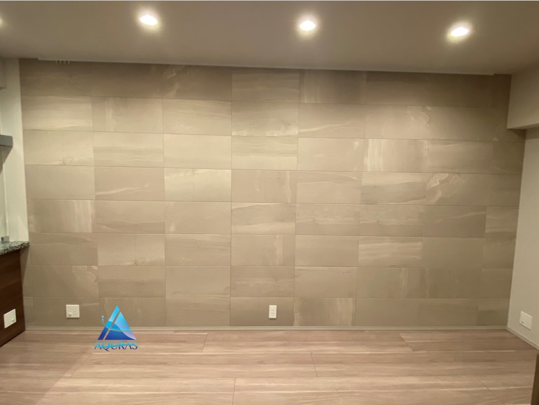 エコカラット リビング【ストーングレース】(ベージュ)目地通し貼り+ピクチャーレール4m(ホワイト) 玄関【ディニタ】(ホワイト)+ミラー幅45cm