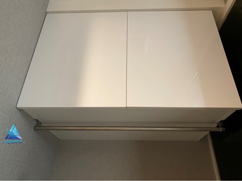 洗面所 洗濯機上吊り戸棚 扉色 鏡面ホワイト ハンガーパイプ設置