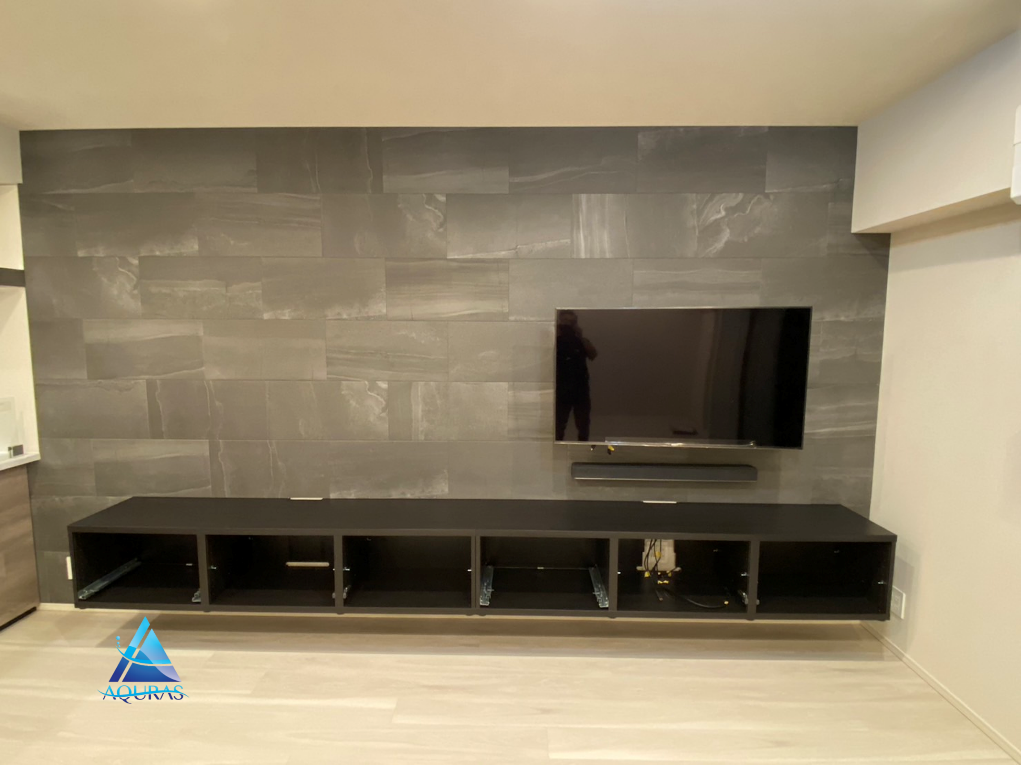 東京都江東区 猿江恩賜公園レジデンス H様エコカラット 玄関【ストーングレース】(ベージュ) 目地通し貼り リビング【ストーングレース】(チャコール)+TV壁掛けビルトイン配線工事・スピーカー設置・ローボード設置