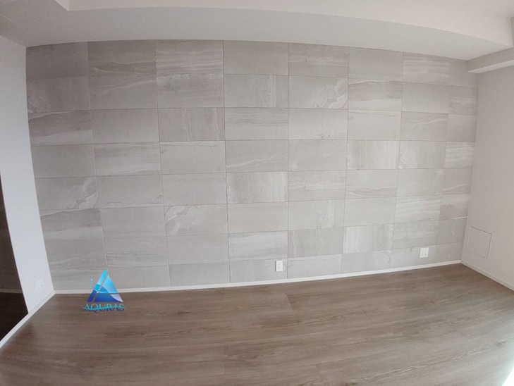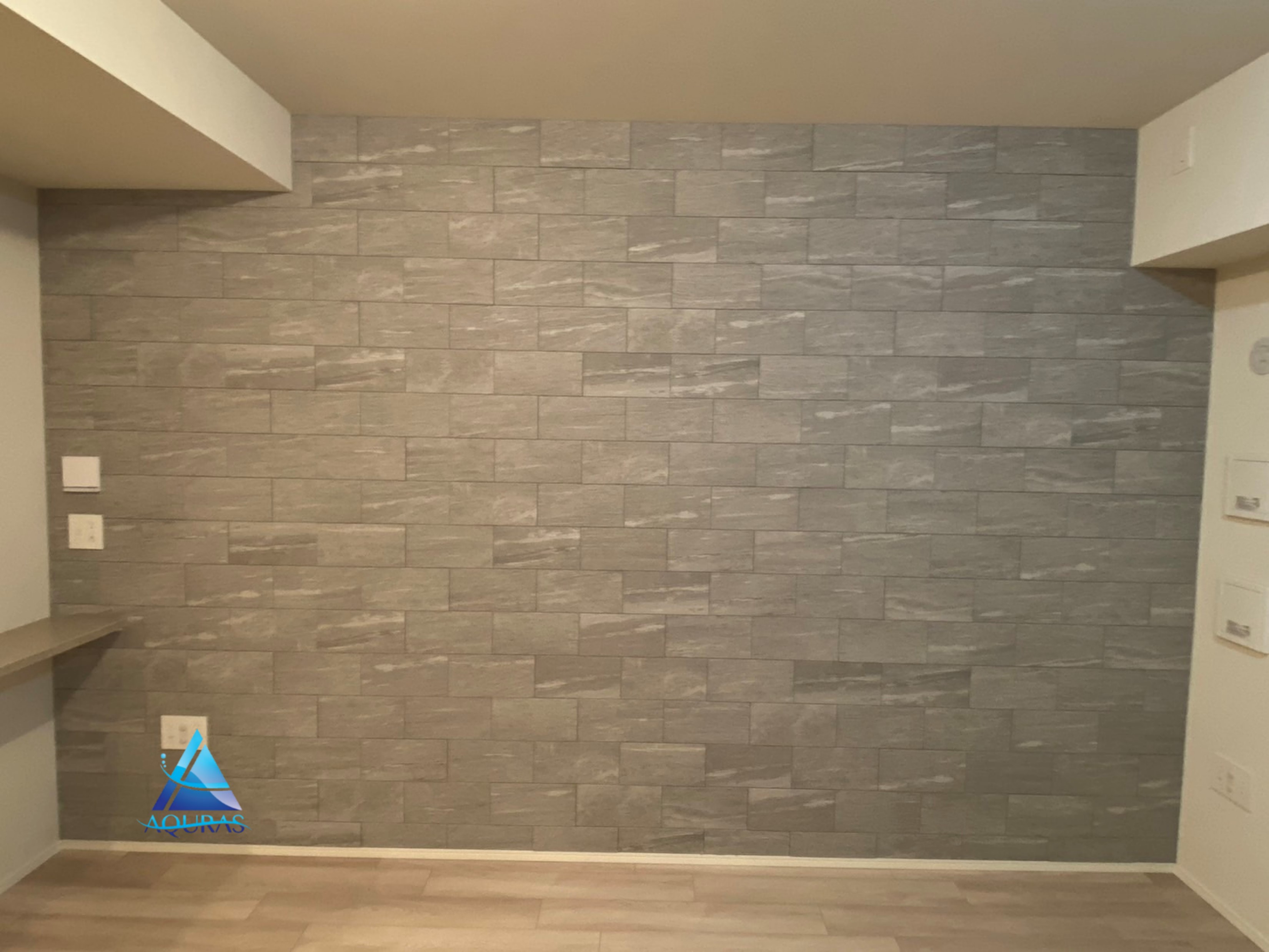 エコカラット リビング【ネオトラバーチン】(ベージュ)芋貼り+ミラー幅60cm +【ルドラNX】(グレー)+テレビ壁掛け金具設置+ビルトイン配線工事+ヴィータス1枚板(ホワイトオーク)W800×D130