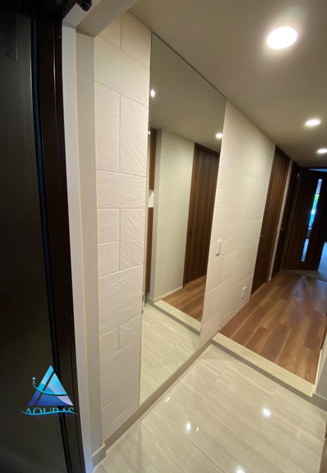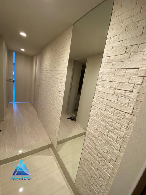エコカラット 洋室【ネオトラバーチン】(ベージュ) キッチン【ランド石ハツリ面】(ベージュ) 玄関【グラナスヴィスト】(ホワイト)+ミラー幅60cm+人感センサープレート交換