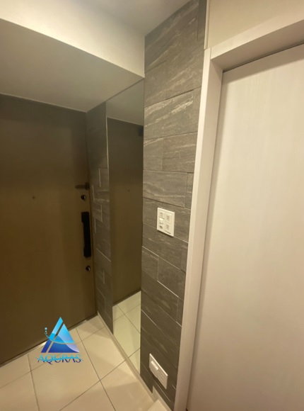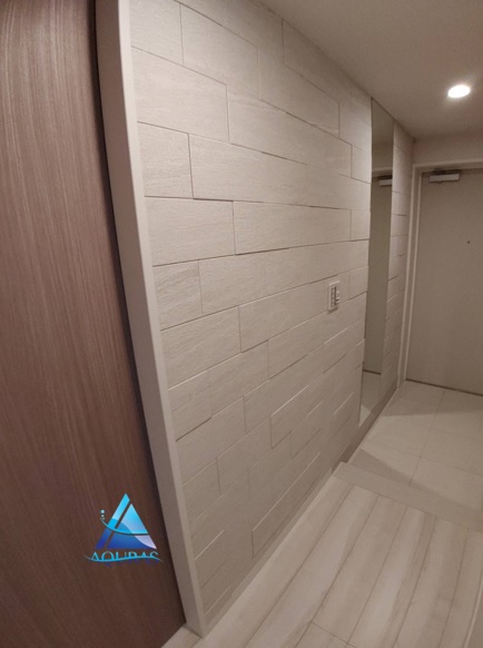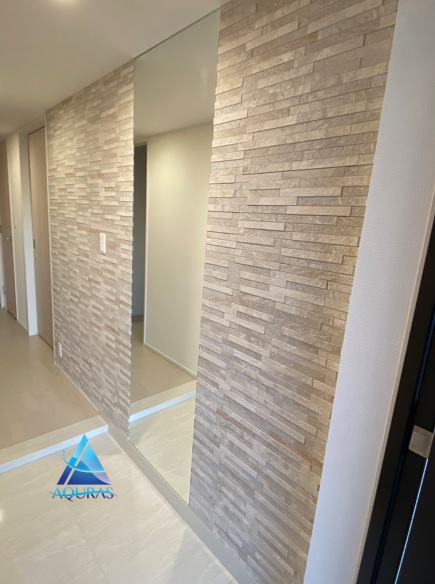 エコカラット リビング【グラナスヴィスト】(ホワイト) 玄関【グランクォーツ】(ライトグレー)目地通し貼り+ミラー幅45cm