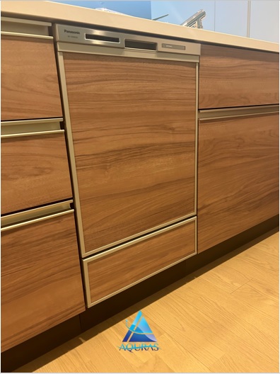 エコカラット【ビンテージオーク】(アイボリー) 玄関【ネオトラバーチン】(ベージュ)+ミラー幅45cm アクセントクロス リビング サンゲツ【RE53787】 キッチン サンゲツ【FE76032】 ビルドイン食洗機 パナソニックNP-45MD9S 面材合わせ